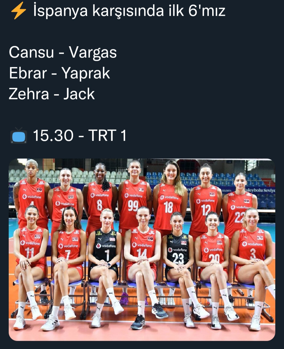 ebrar'ın bazı anlarda topları öldürememesi dışında takım iyiydi, yaprağın hırsını beğendim. ama ispanya çok zayıf bir takım oyunumuzu diğer maçlar için daha da geliştirmeliyiz önceki maçlardaki bazı sorunlar yine gözüme çarptı. savunma ve top karşılamada bazı anlarda sıkıntı yaşıyoruz.