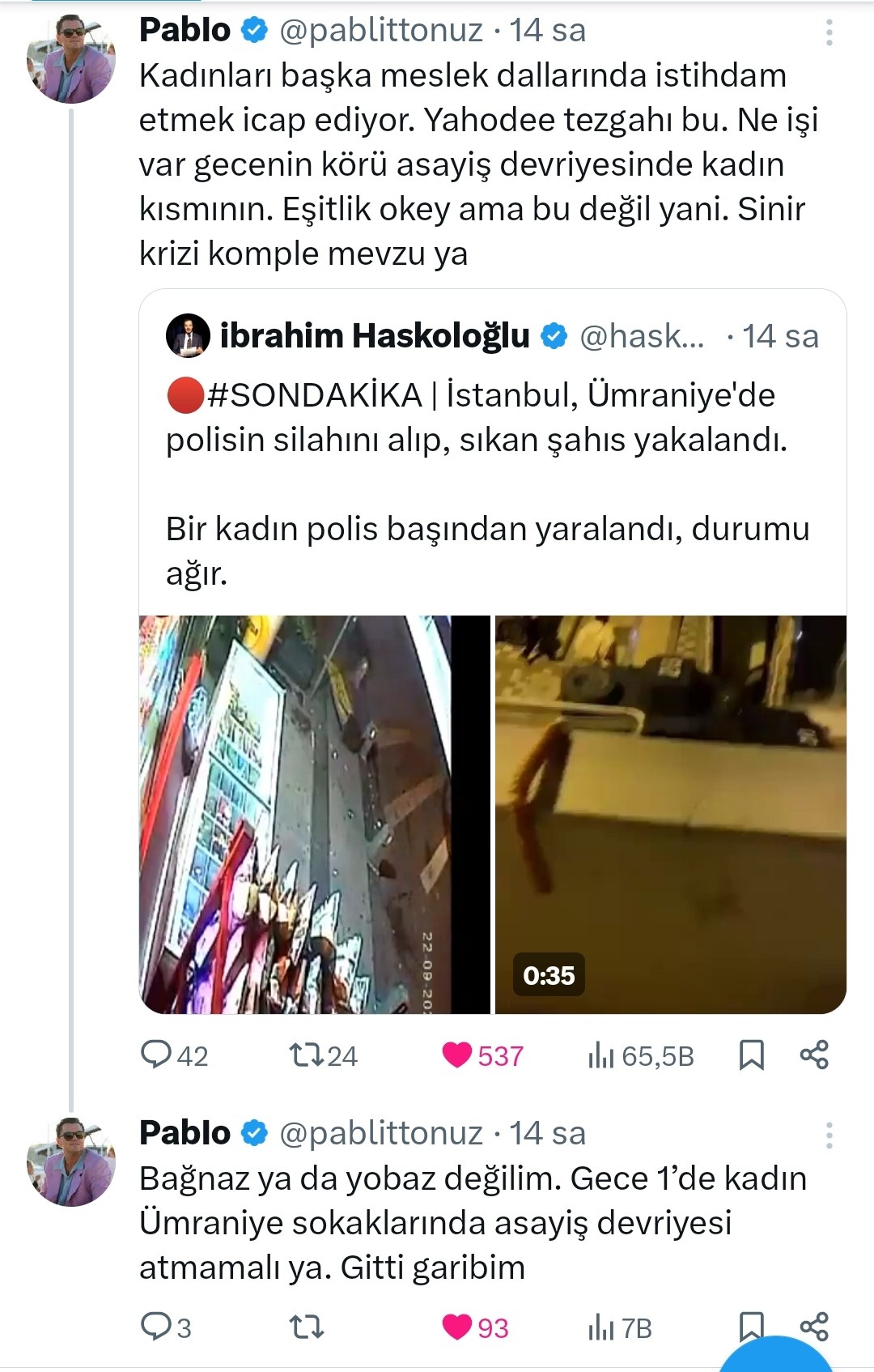 suçlu desen askerlik yaşı gelmemiş, 26 dosyası var. 91 doğumluyum bizim doğru düzgün karakol kapısından girmişliğimiz yok. onun yaşındayken sokak arasında top oynuyorduk biz, abiler gelip birden maçımızı dağıtsa sesimiz çıkmazdı. bir suçu olsa iftira diyelim, 26 suçu olan birini kanunlarımız ne zaman cezalandırmayı düşünüyor. ulan suç işlemeye reşit olunca başlasa, sırf fikirlerini söyledi diye içeri atılan dilruba gibi her suçundan 1 ay içeri atılsa bile henüz içerde olurdu. herifte cinsel suç var, torbacılık var, elini kolunu sallaya sallaya sokakta geziyor. herif polisin silahını alıp polis vuruyor daha ötesi var mı. bu cesaret nereden geliyor.
