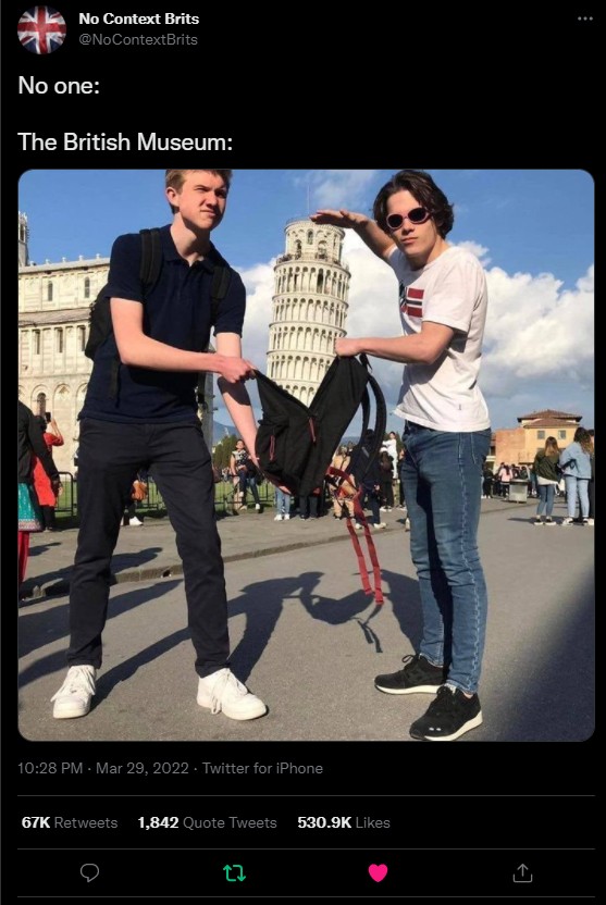 ingiltere'nin tarihi eserleri örgütleri besleyerek devlet eliyle nasıl çaldığı, bunları da zamanla alıp kendi müzelerine götürdüğü, bunun üzerinden güzel bir turizm kültürü oluşturduğu konusu. ya reddit ya da 9gag ikisinden birisi şimdi tam hatırlamadım(zaten 9gag de reddit'ten çalan bir site o yüzden aynı şey) bununla ilgili bir konu ortaya sunmuş, sayfalarca kanıtlı şekilde tarihi eserler thread halinde üyeler tarafından sıraya dizilmişti. bu söylediklerimi reddit ve amerikan mizahı kurtları belki hatırlayacaklardır. ama benim şu anda bulmam mümkün değil.