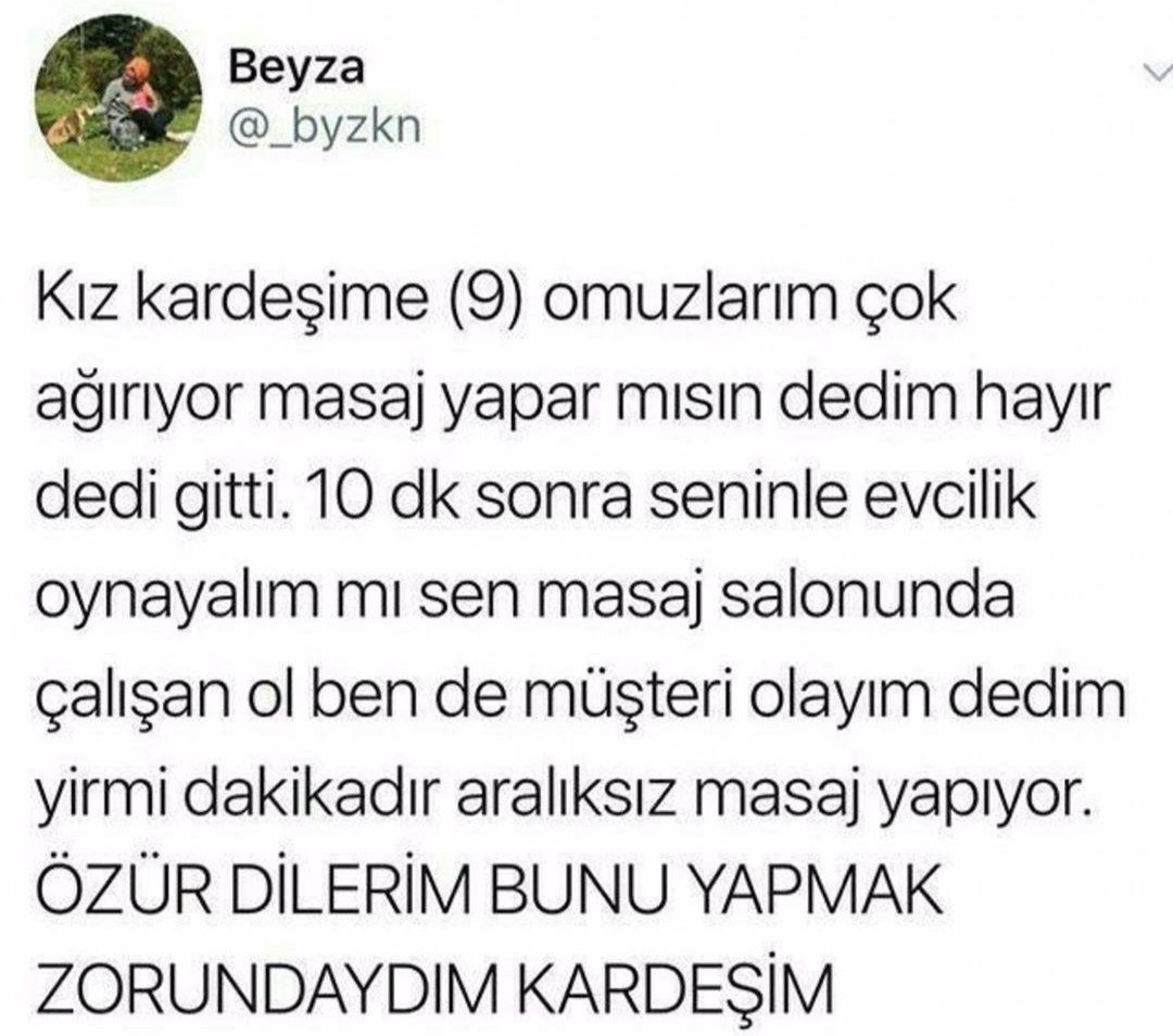 ama onlarda az değiller lütfen. şimdi ablalara terör diyorsak onlar da canavarlar resmen. evin en masumunu oynayıp her defasında tüm suçu bana atardı. bu yüzden az yemedim terlik. * birde küçücük oldukları içinde şakasına bile vuramıyorsun ama onlar ne ala memleket diyip kafa göz dalıyor resmen. bu canavarın kafama demir oyuncak araba attığını bilirim.