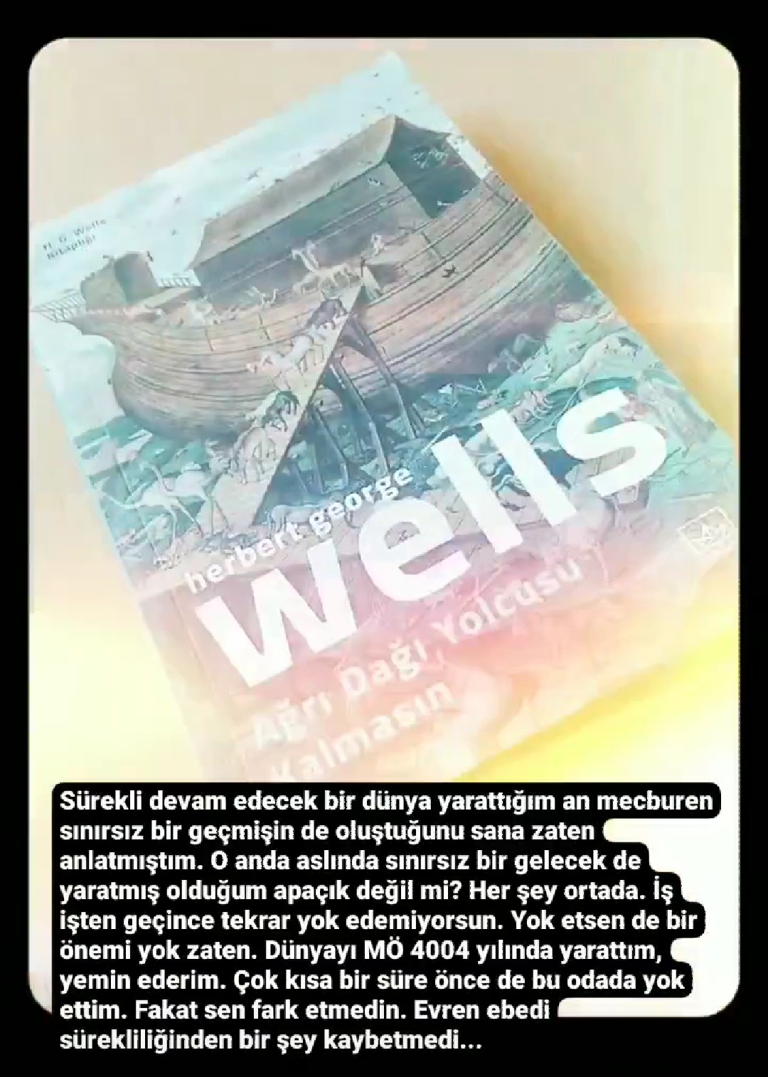 *dünya’nın halihazırdaki vaziyetine sert eleştiriler getiren, hikâye tarzındaki denemesi ağrı dağı yolcusu kalmasın’da wells, terazinin tartmakta bocaladığı konulara mükemmel bir giriş yapıyor. tanrı, başka bir ağrı dağı’na yolculuk edecek gemiyi hazırlaması için yeni peygamberini arıyor ve nuh lammock’ı ziyaret ediyor. böylece wellsvari monologlar şöleni başlıyor. wells/lammock, kitab-ı mukaddes’in bize anlattığı tarihi, sınır tanımadan ama eğlenceli bir şekilde sorgularken geminin yapımı ve yolculuk planları ise her adımda daha çok çıkmaza giriyor.*