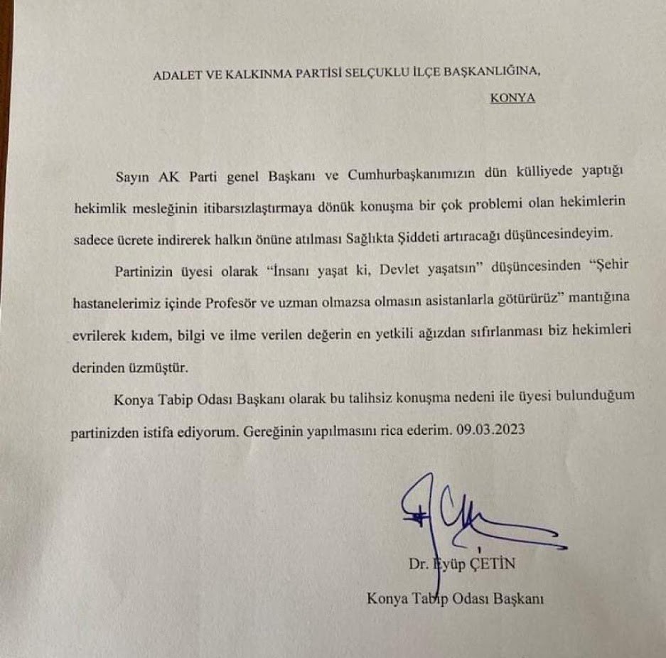 akp üyesi konya tabip odası başkanının akp'den istifa etmesi
