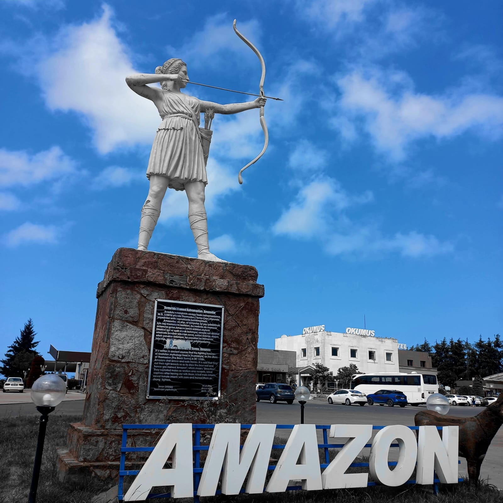 bornova'da elinde ok yayla bir amazon kadın heykeli bulunur. altında anaların anası kibele'nin kadın savaşçıları amazonlar, saygıyla anıyoruz yazılıdır.