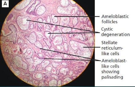 -foliküler paternde çevresinde palizat yapan preameloblast benzeri hücreler bulunan orta kısmı stellat retikuluma benzer şekilde gevşek tertiplenmiş hücresel adalar bulunmaktaır.