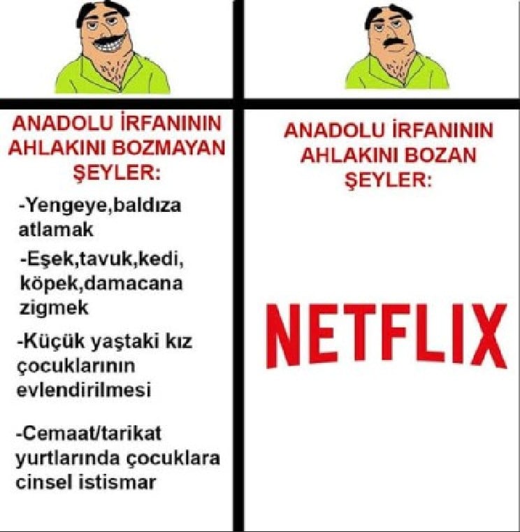 her türlü ahlaksızlığı meşru görüp, ''netflix ahlagımızı bozii'' diyenlerin irfanıdır.
