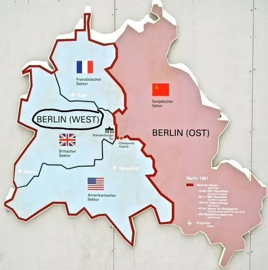 berlin duvarı'nın ikiye böldüğü, batı almanya'nın doğu almanya içindeki ufak bir parçası olan batı(west) berlin