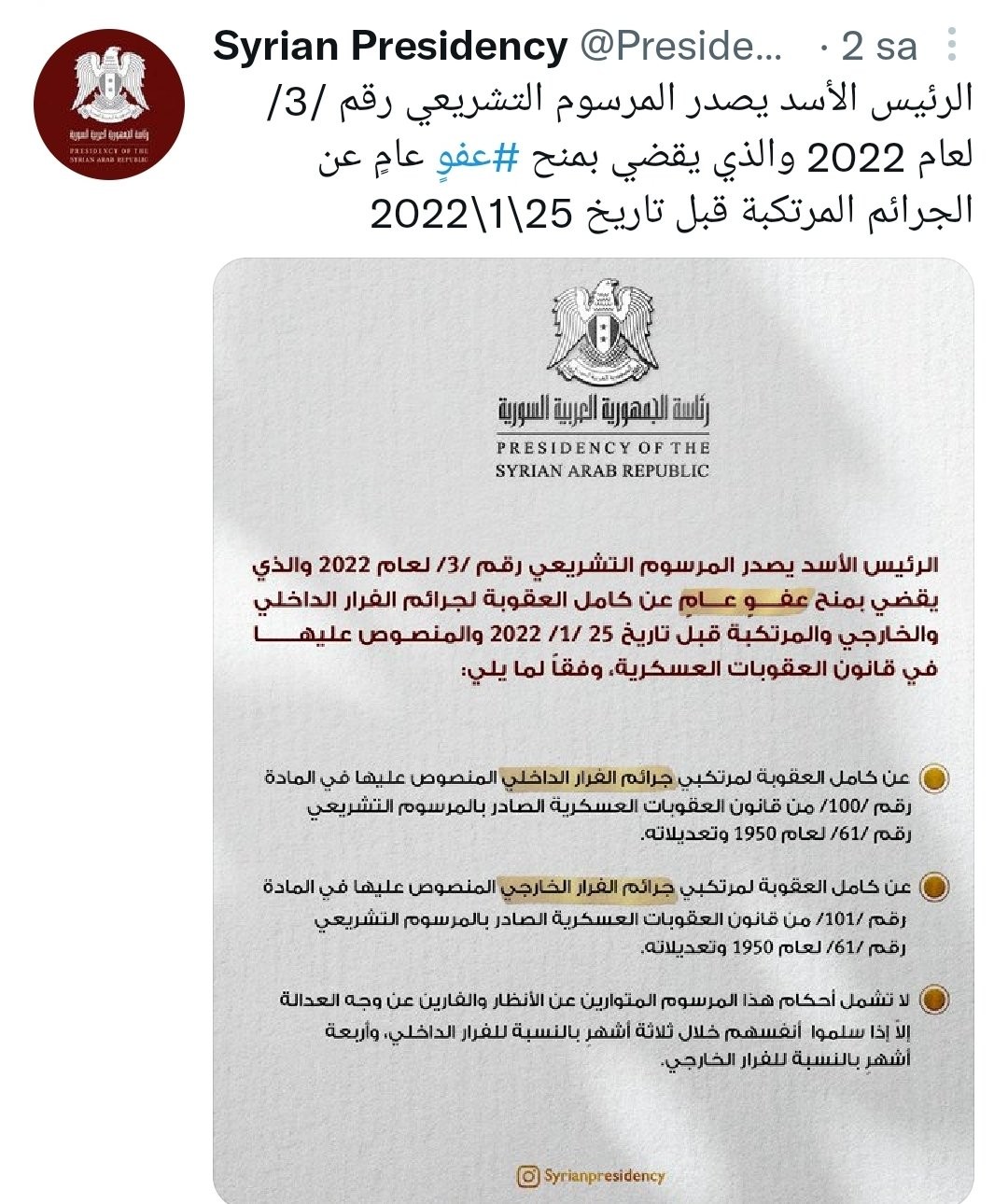 suriye devlet başkanı beşar esad, 25 ocak 2022 tarihinden önce işlenen suçlar için genel af çıkardı. karar, suriye'yi terk eden suriye vatandaşlarını da kapsıyor.