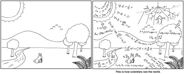 insanlar gökyüzüne bakıp romantizm peşinde koşarken yıldızların bana anımsattığı şey kocaman birer plazma topu oluşları. güneşli bir günde bir parkta oturup sıcak havanın tadını çıkarırken düşündüğüm şey serap olayının nasıl oluştuğu. evde bir şeyi tamir ederken aklıma gelen şey, bir devrede elektronların hareketinin bizim için teknolojik olarak ne büyük nimet olduğu vesaire...