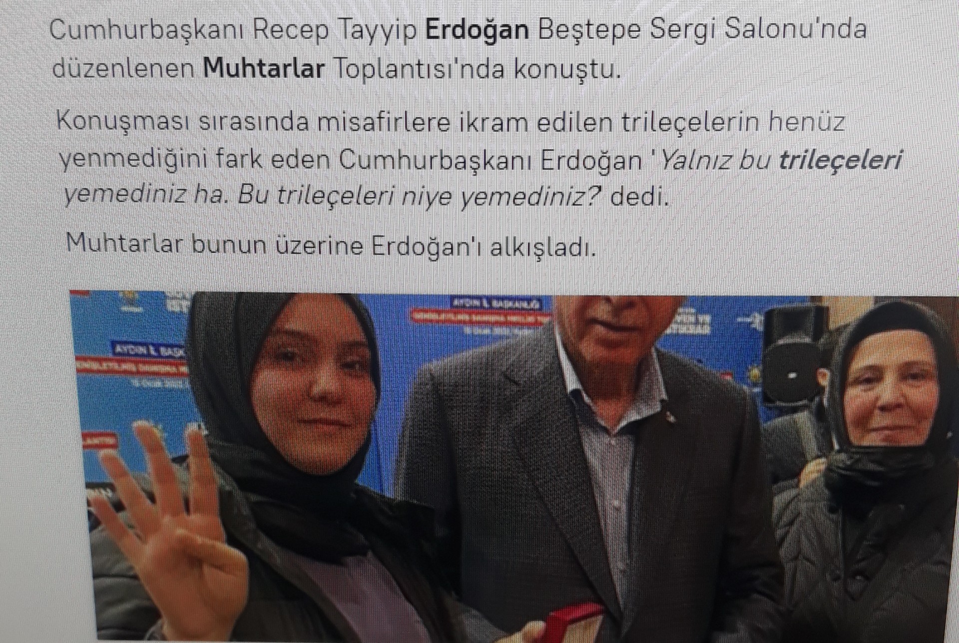 ülkenin kayıtlı nüfusu 84 milyondan fazla. bu 84 milyon insandan herhangi biri bu soruyu sorduğunda haber olmaz tabi ki ama bu soruyu soran türkiye cumhuriyeti cumhurbaşkanı olunca haber oluyor. evet, dünya lideri cumhurbaşkanımız recep tayyip erdoğan han hazretleri muhtarlar ile yaptığı toplantı sonrasındaki konuşmasında kürsüden muhtarlara seslenerek ''o trileçeleri neden yemediniz?'' diye sormuştur. ülkemizin ciddi bir sorunu idi trileçe yenmemesi, cumhurbaşkanımız da bu konuya değinmiş.