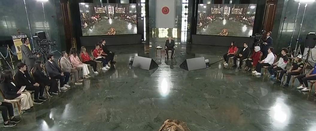 abi gençlerin oturuşuna bak. ellerini kollarını nereye koyacaklarını şaşırmışlar. yanlışlıkla kolunu kaşısa biri, şaaaak cumhurbaşkanına hakaretten içerde olabilir. sanki karşılarında roma imparatoru var.