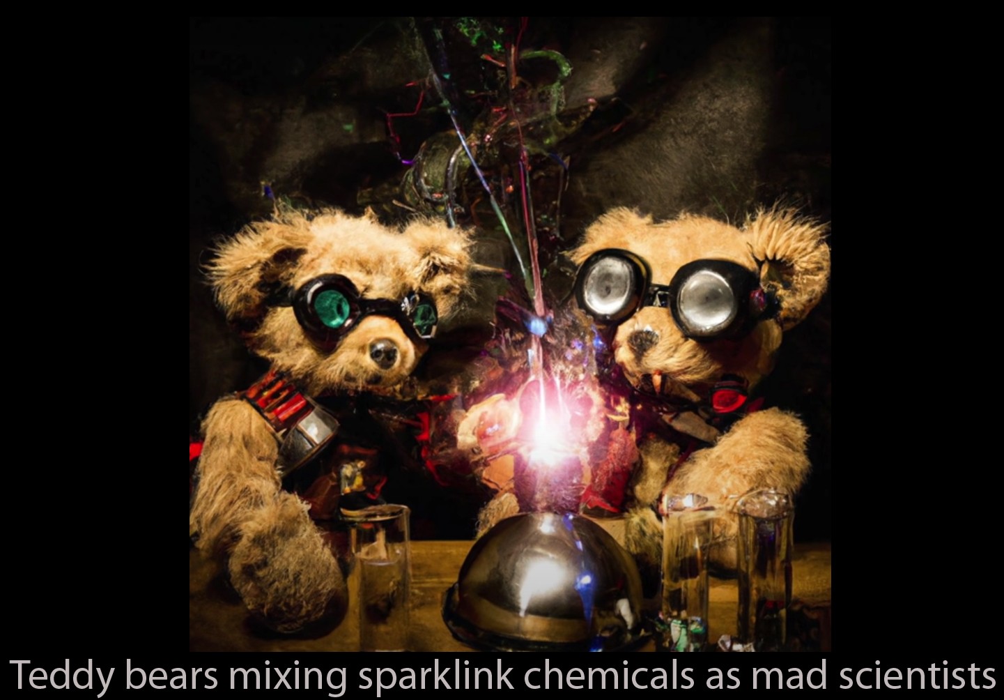birçok yapay zekâ temelli tasarımda benzer sorunlar mevcut. ancak yine de dall-e'nin oldukça iyi sonuçlar çıkardığını söylemek için bir engel yok. örneğin aşağıda "teddy bears mixing sparkling chemicals as mad scientists" talebini yerine getirdiği bir kare var. yani "patlayan/köpüren/ışıltılar saçan (hangisini tercih ederseniz) kimyasalları karıştıran çılgın bilim ayıları". tabii ki daha güzel bir tanım yapılabilir ama isteğin en kısa ve anlaşılır şekilde anlatılması esas olduğundan ben de böyle çevirmeyi seçtim.
