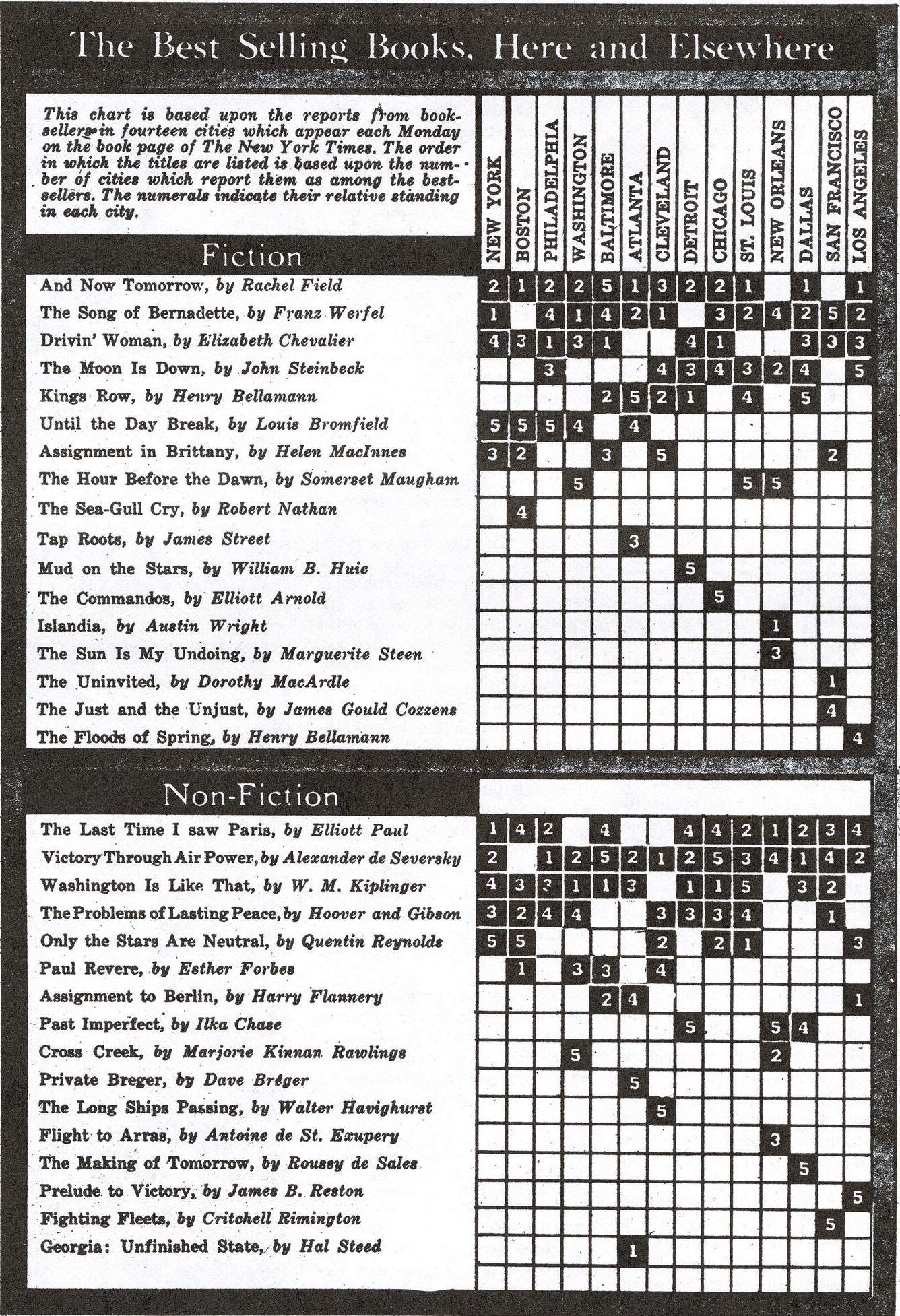 bu liste derginin ilk editörü olan harry thurston peck tarafından on dört farklı şehirde bulunan kitapçılardaki çok satan kitaplarla hazırlanmıştır. listenin hemen yanında kitabın hangi şehirde kaçıncı sırada olduğu bulunur.