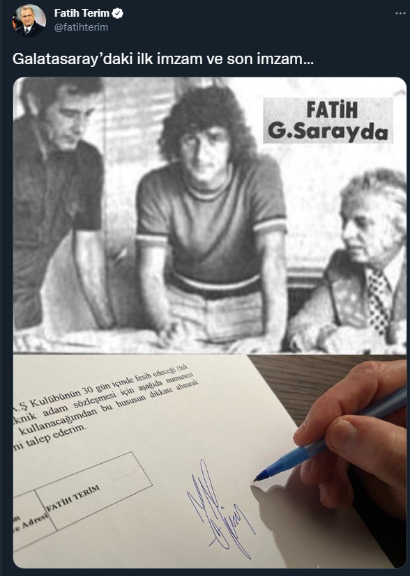 geçtiğimiz günlerde galatasaray ile yollayı ayrılan fatih terim'in az önce attığı tivittir. galatasaray'a futbolcu olarak geldiği günkü imza töreninden bir fotoğraf ile geçtiğimiz günlerde sözleşmesini sonlandıran sözleşmeyi imzaladığı anın fotoğrafını birlikte paylaşmış fatih terim.