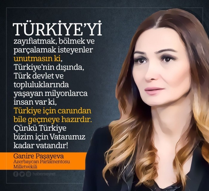 ganire paşayeva, 1975-2023 yılları arasında yaşamış azerbaycan türk'ü yazar ve siyasetçi. ganire paşayeva, yaşadığı süre içinde türk dünyası'nın sorunlarıyla ilgilenen büyün bir türkçü'ydü fakat aliyev diktatörlüğü onu fazla yaşatmadı. azerbaycan'ın asenası ganire paşayeva'yı saygıyla, sevgiyle ve rahmetle anıyoruz.