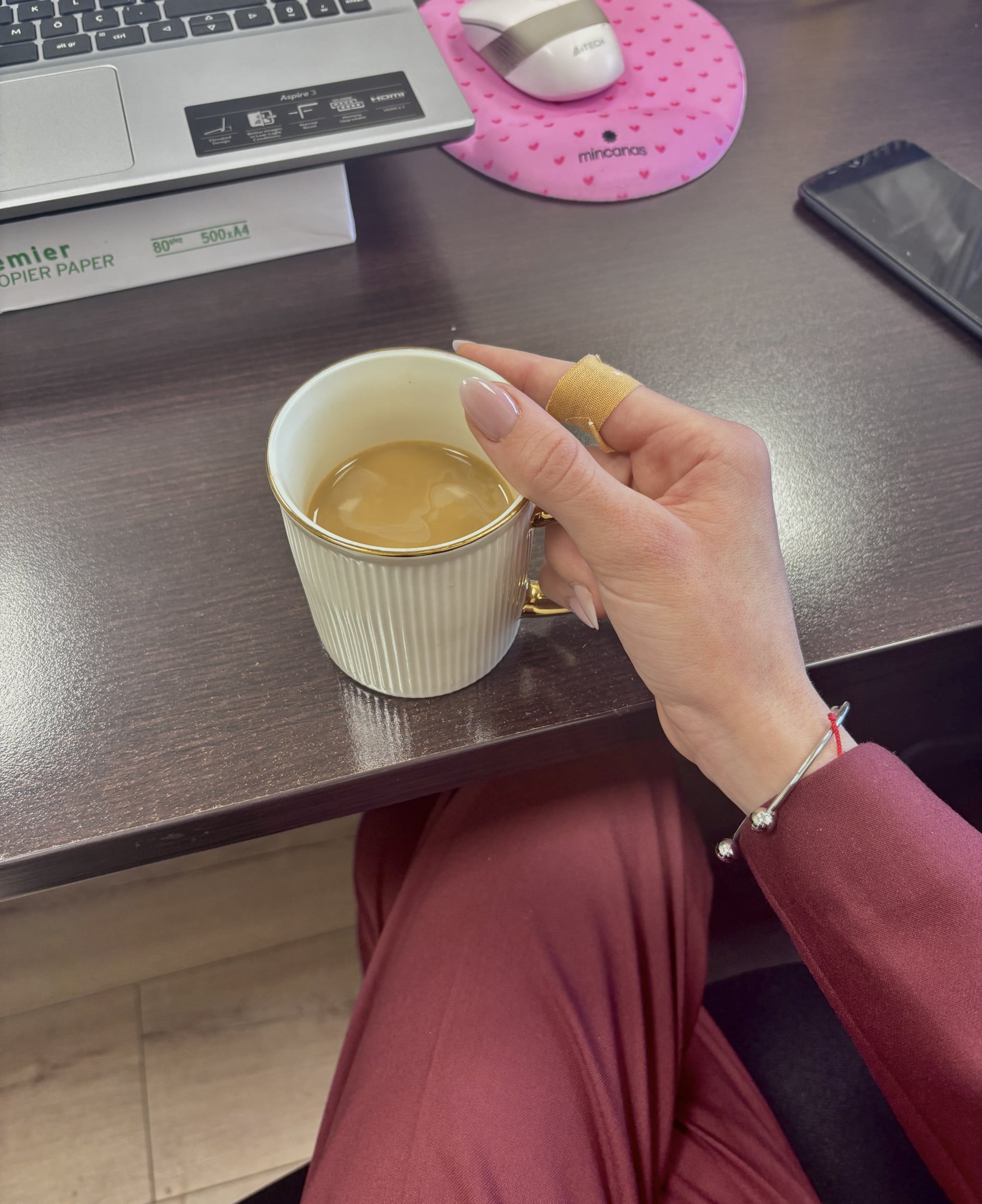 yarısını içtiğim lattem, yaralı parmağım, milattan önce üretilen şirket telefonum , maskülenliğin bayrağı olan takım elbisem ve laptop standı olarak kullandığım bir top a4 kâğıdım ile güne başladım. sürü kadar adamsınız bana bir laptop standı almadınız.. yazıklar olsun size..