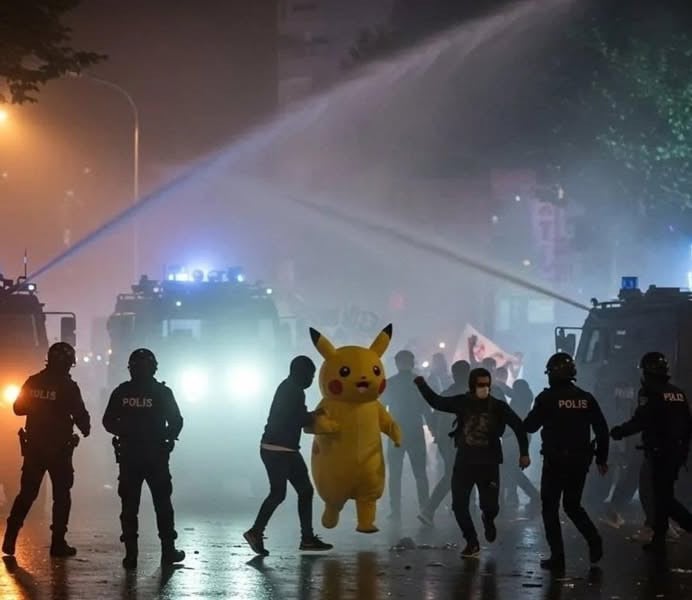 polis silahsız, savunmasız genç kadınları, öğrencileri, gençleri, yaşlı başlı insanları ayrım yapmadan eşit biçimde kovalayıp jopluyor, gaz bombası atıyor, tazyikli su fışkırtıyor, kelepçeleyip göz altına alıyor.. yoksa pikachu ile polisin ne derdi olabilir. belli ki bu dış minnakların işi. ve hökumat karşıtı bir durum. yarın da red kit, zagor, teksas tommiks, conan, kızıl maske ,donald duck, örümcek adam, mickey mouse'un da katılacağının işareti..