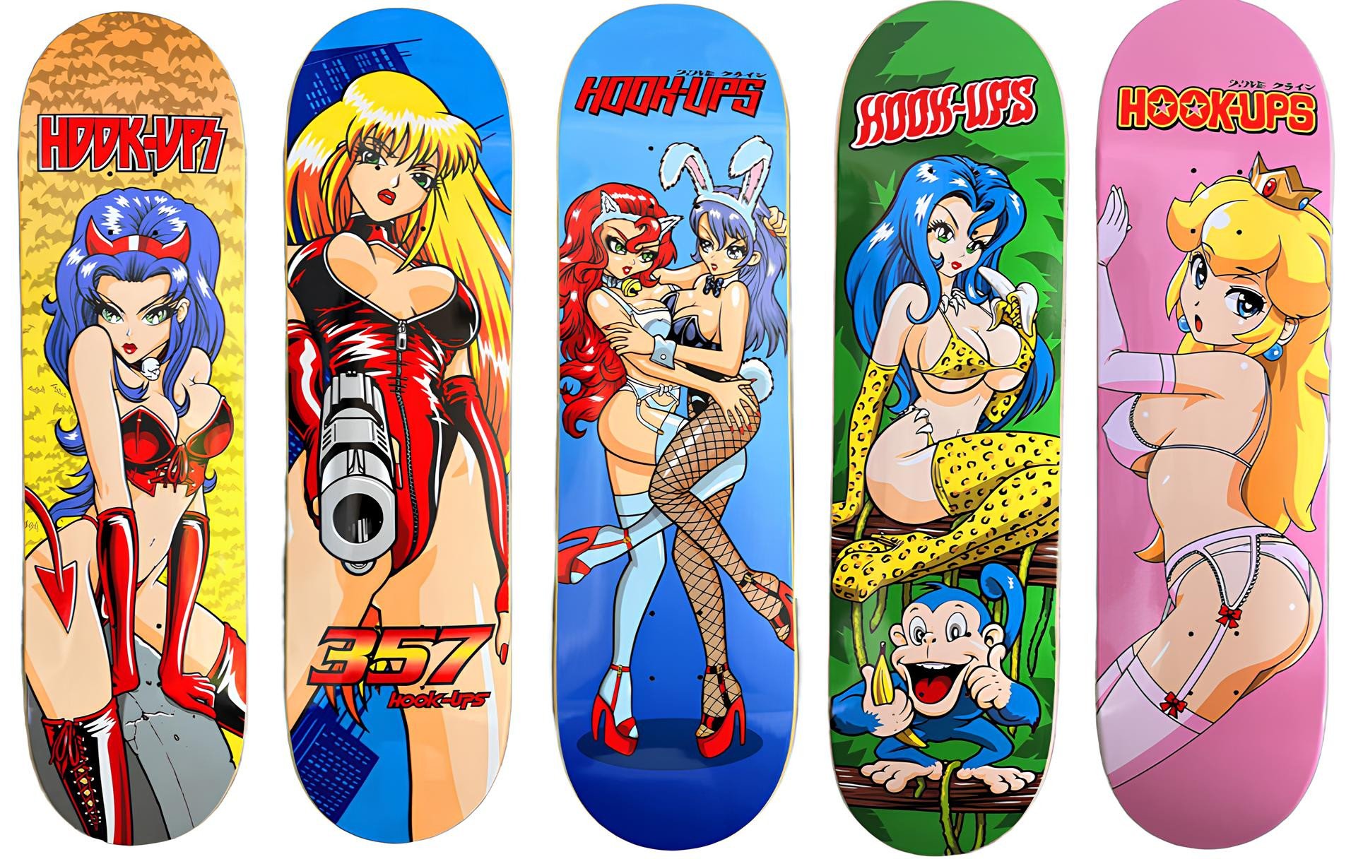 hook-ups, 1993 yılında profesyonel kaykaycı jeremy klein tarafından kurulan ve kaykay dünyasında kült statüsüne erişmiş bir markadır. başlangıçta tişört tasarımlarıyla yola çıkan klein, kısa sürede odağını tahtalara çevirmiştir. manga ve anime estetiğini kullanarak yarattığı kadın karakterleri ve provokatif temaları cesurca tahtaların altına taşıdığı için, bir dönem ailelerin en çok nefret ettiği isimlerden biri haline getirmiştir.