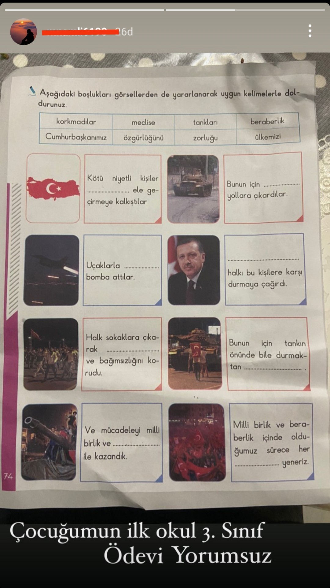 ilkokul 3. sınıf öğrencisine verilen 15 temmuz konulu ödev
