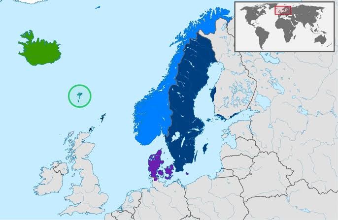 isveç, norveç, finlandiya, danimarka, izlanda, faroe adaları, aland adaları'dan oluşan kuzey avrupa coğrafyası. fince (ural) hariç diğer diller (sami) birbirine benzer.