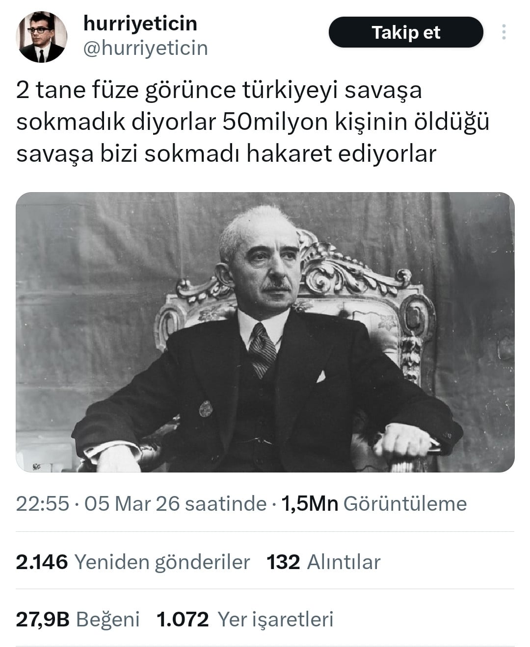 türkiye'yi ikinci dünya savaşına sokmayarak ateş çemberinden ustalıkla geçirmiş, din tüccarlarının sevmediği büyük komutan, devlet adamı.