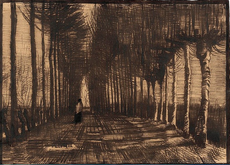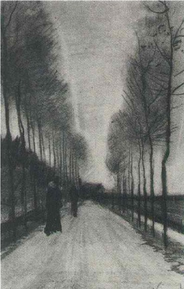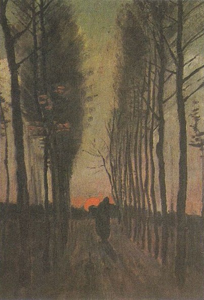 "en son yaptığım şey kavaklı yolun oldukça geniş bir çalışması ve bu yolda sararmış sonbahar yaprakları, orada burada güneş ışığı, yere düşmüş yapraklara parıltı saçarak, ağaç gövdelerinin uzun gölgeleri ile bir rekabete girer. yolun en sonunda küçük bir kulübe var, ve onun üzerinde mavi bir gökyüzü sonbahar yapraklarının da üstünde..."