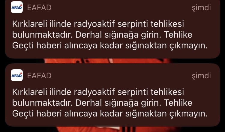insanın yüreğini ağzına getiren bildirim. abiciğim tatbikat yapacaksınız madem insan öncesinde bir söyler değil mi? "sığınaklara girin ve haber gelene kadar orada kalın" diye insanları uyarıp neredeyse 40 dakika sonra "şaka lan şaka. tatbikat yapıyoruz" denir mi? manyak mısınız?