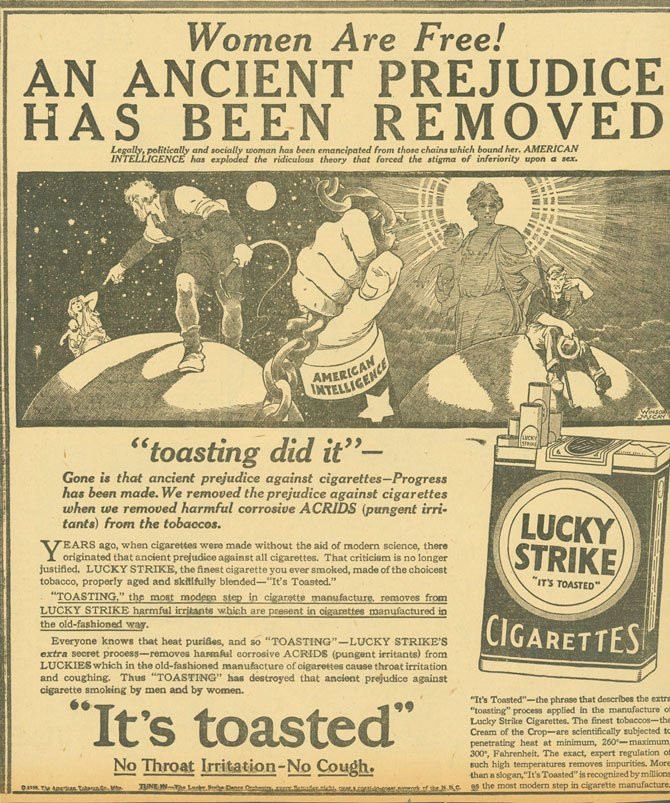 halkla ilişkiler'in kurucu babası olarak sayılan edward bernays, 1920'li yıllarda kadınların toplum içinde sigara içmesinin uygun olmadığı bir dönemde bunu bir toplumsal mesele haline getirerek, 1929 yılında paskalya töreninde özgürlük meşalesi adını verdiği bir yürüyüşle kadınların elinde sigaralar ile yürümesini ve bunu sigara içen kadınlar için bir özgürlük simgesi olarak benimsenmesini sağladı.