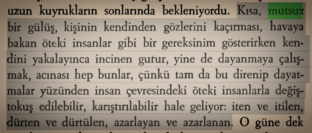 mutlu olur gibi olduğunda bunun gerçek bir mutluluk olmadığını bilmektir, mutsuzluğa doymak mutsuzlukla beslenmemek ama