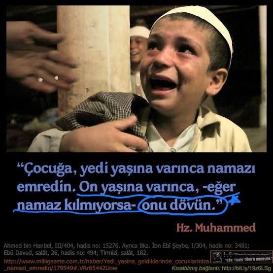 kütüb-ü sitte hadislerinin ahmet bin hanbel ve ebu davud bölümlerinde geçen kan donduran ve skandal bir ifadedir. bu ifadede her şey açıktır: "çocuklar, belirli bir yaşa gelince müslüman anne-babasına göre çocuğun dini vecibesi namaz kılmaktır. bu çocuk, 10 yaşına geldiği takdirde namaz kılmazsa, ebeveynleri olarak onu dövün!."