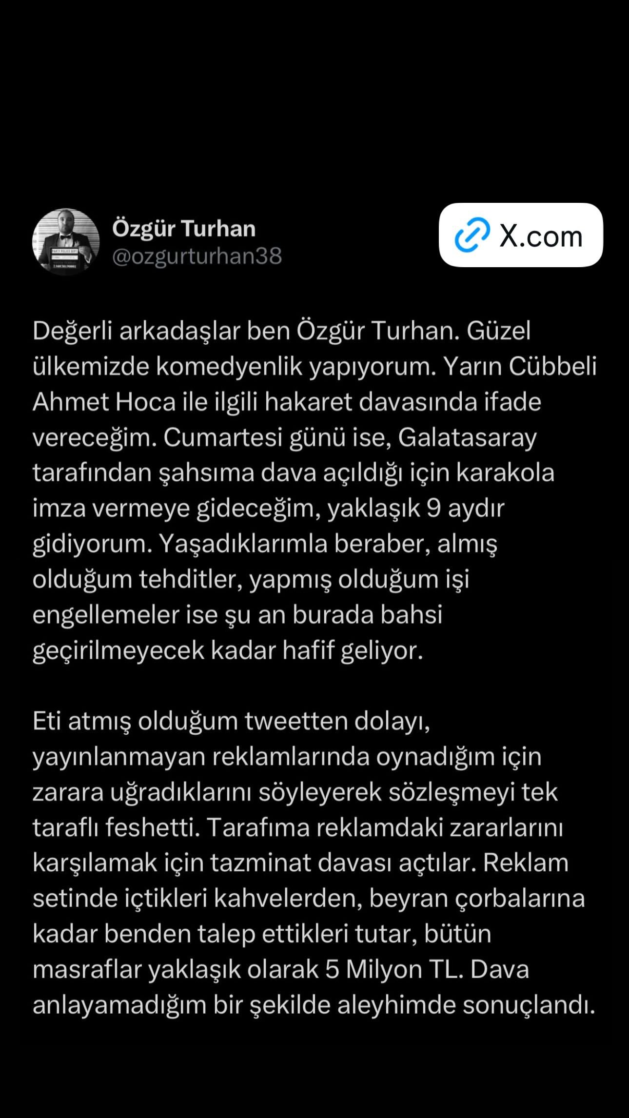 galatasaray'ın açtığı davadan ötürü özgür turhan adlı komedyen 9 aydır imza vermeye gidiyormuş.
