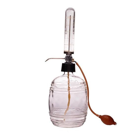 alt kısmındaki geniş kısımda duran kolonya pompalanır ve yukarıdaki ölçekli dar ve uzun kısma doğru çıkardı. daha sonra ise iki kısım arasında olan uzun bir metal çubuk görüntüsündeki musluktan kolonya akardı.
