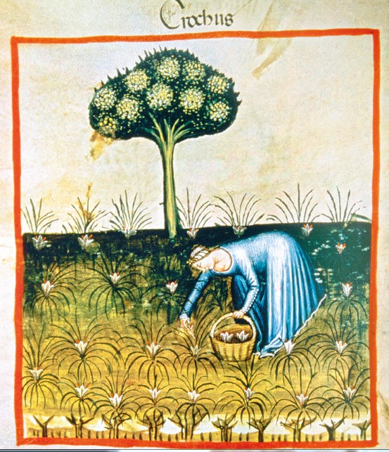 - 15. yüzyıla ait resim, bir kadın safran topluyor.