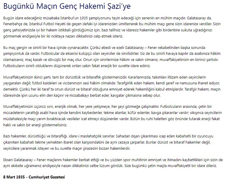 yazıda, hakem şazi tezcan hakkında, 1935 senesinde oynanan bir gs-fb maçı öncesinde cumhuriyet gazetesi'nde çıkmış bir köşe yazısı var.