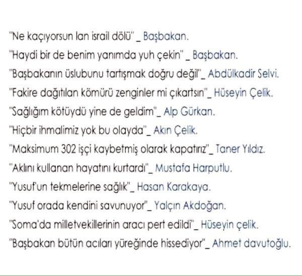 ülke yangın yeri olmadı. "kimse ne oluyor?" demedi. üstüne üstlük sonraki seçimlerde akp oyu yüksek çıkınca "katiline tapan halk..." felsefesi yaptılar. halbuki kazadan önce somada çalışan bütün madenciler kazadan sonra kovulup yerlerine iç anadoludan yeni köleler getirilmişti.