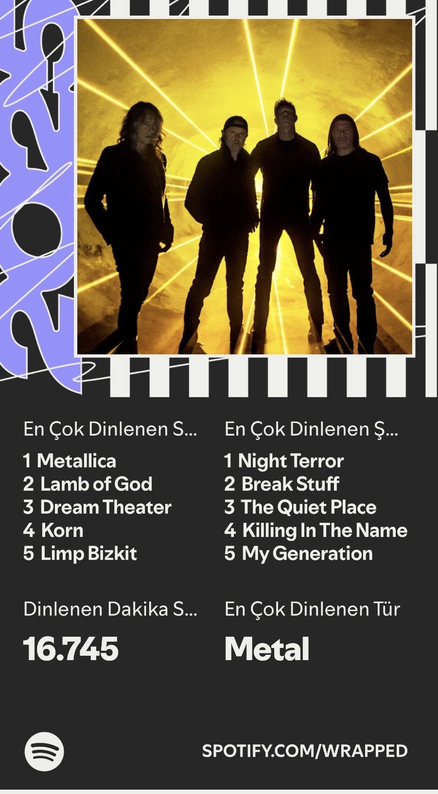 şaşırtmayan bir liste oldu benim için. sadece en çok dinlediğim gruplar 3 senedir sürekli yer değiştiriyor ve bu senenin kazananı metallica oldu. en çok dinlediğim şarkı da dream theather’dan night terror oldu. bunu da şarkı olarak olmasa da tahmin etmiştim. #3782738