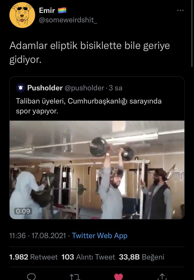 kabil’i ele geçiren taliban üyeleri cumhurbaşkanlığı sarayı spor salonunda görüntülendi. önce kadınların tek başına evden çıkmalarına izin verilmesi,sonra spor, başkan ve hükümet üyeleri hariç kamu çalışanlarının göreve dönmelerini istemesi,gelişme var bunlarda(!)