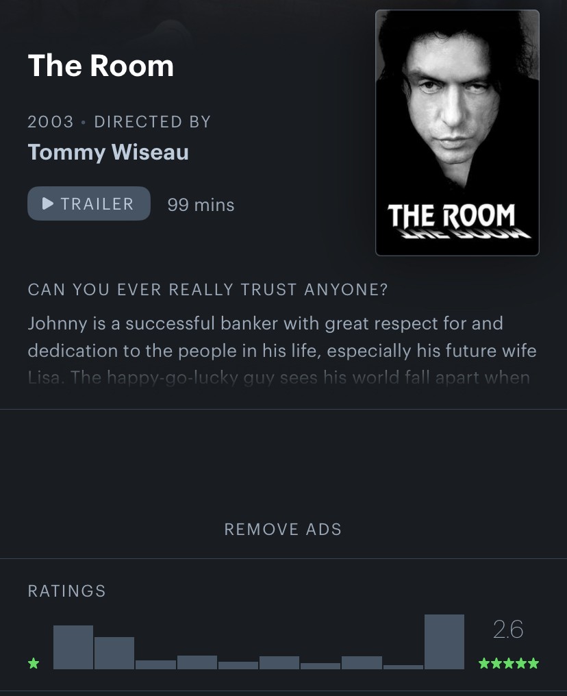 yapımcı, yönetmen, senarist ve başrolde tommy wiseau'nun kombo yaptığı şahane bir kötü film.