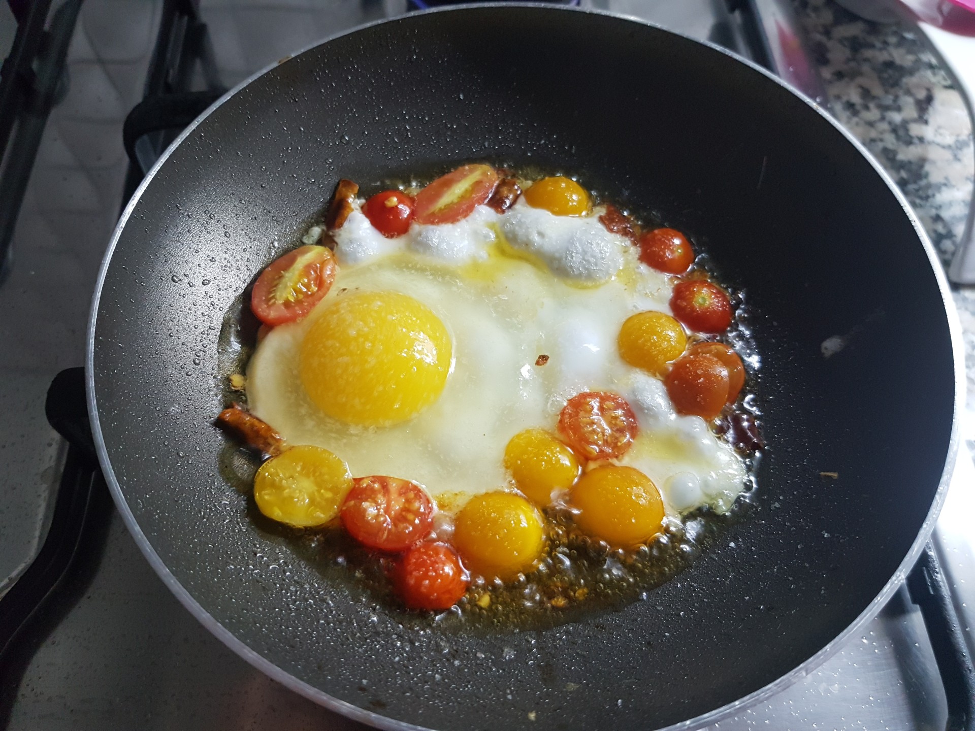 yumurta sarısından biraz küçük çeri domateslerden 6-7 tane alıyoruz. sonra ikiye bölüyoruz. tavaya biraz zeytinyağı döküp domatesleri birkaç dakika soteliyoruz ve ardından yumurtayı kırıyoruz ama sarısını dağıtmıyoruz biraz tuz atıyoruz. tavanın üzerine bir kapak kapatıp 3-5 dakika pişiriyoruz.