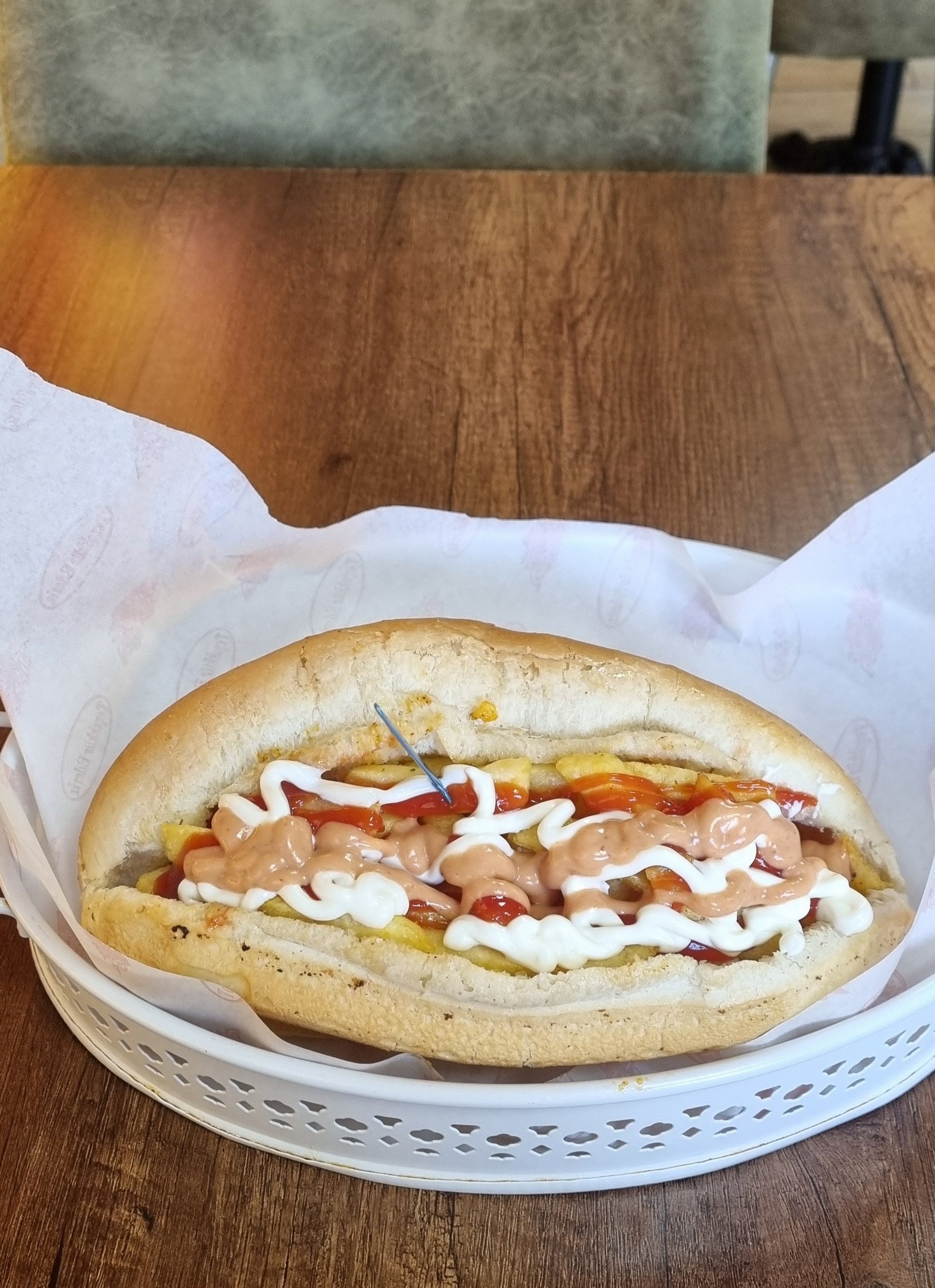 elit hobilerim arasında, uzun süredir yemediğim sosisli patso söyledim. patatesler hazır superfresh (poşeti gördüm) , masa sallanıyordu buradan eksi yazar, ekmeğin iç kısmı sos eksik ama hardal dokunuşu hoşuma gitti. fiyat 200ml coco cola + sosisli patso 120, gayet ideal, malzeme bol ve doyurucu bu nedenle fiyat performans 10/9 , lezzet klasik bir olayı yok. bir kıtırlık aradım, turşu gibi. ekmeği güzeldi, özel yaptırmışlar muhtemelen. genel puanım 6.2, dediklerime kulak asarlarsa ve en önemlisi ev yapımına geçerlerse 8'e çıkabilir. bir kaç not aldı, el yapımı patates konusunda muhafazası zor diyor, kısmen haklı ama sadece fiyat performansla işlemez , emek lazım. ortalık rekabet kaynıyor, gelip ekmek arası patates yiyeceğine bir çok seçenek var doyuruculuk bu kadar olmasada.