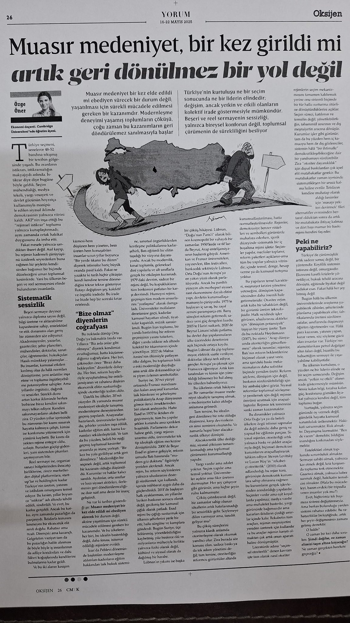 muasır medeniyet bir kez elde edildi mi ebediyen sürecek bir durum değil; yaşatılması için sürekli mücadele edilmesi gereken bir kazanımdır. modernleşme deneyimi yaşamış toplumların çöküşü, çoğu zaman bu kazanımların geri döndürülemez sanılmasıyla başlar. türkiye’nin kurtuluşu ne bir seçim sonucunda ne bir liderin elindedir; değişim, ancak yetkin ve etkili olanların kolektif irade göstermesiyle mümkündür. beşeri ve reel sermayenin sessizliği, yalnızca bireysel konforun değil, toplumsal çürümenin de sürekliliğini besliyor