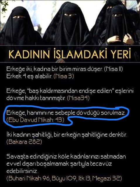 kur'an'daki nisa 34, kütübü sitte'deki ebu davud'un "erkeklerin kadınları dövmesi" gibi kötü ve vahşi durumlar işte hep bu yüzden.