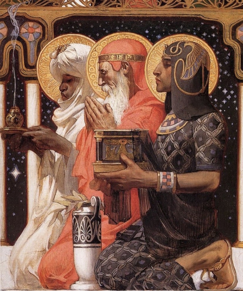 orijinal adıyla “three wise men”. leyendecker’ın 1900’de resmettiği, art nouveau(biraz da art deco) ve pre-raphaelist tarzda denilebilecek yağlı boya eseri. eserde üç erkek figür görülmekte. bu üç adam, yeni doğmuş isa’ya saygı ve itaatlerini iletmek için diz çökmüş şekilde resmedilmiş. her biri kendi ikliminin izlerini taşımakta. en sağdaki figür, siyahlar içinde genç bir adam, açıkça mısır kökenli olmakla beraber elinde içinde altın olan bir muhafaza tutuyor. bu hediye isa’nın krallar kralı olmasına bir atıf olarak değerlendiriliyor. ortadaki figür -kırmızı bir cüppe ve başlık giymiş ve ellerini dua eder biçimde birleştirmiş olarak- ise açıkça avrupalı adamı andırıyor. hemen yanında ise hediyesi mürrüsafi de denilen değerli bir reçine var. bu da isa’nın ölümlü yanına bir gönderme. en soldaki beyaz cüppeli, kabarık başlıklı, siyah tenli adam ise doğulu insanı temsil ediyor. iki eliyle tuttuğu hediyesi tütsü ise isa’nın ilahi yanına bir gönderme.