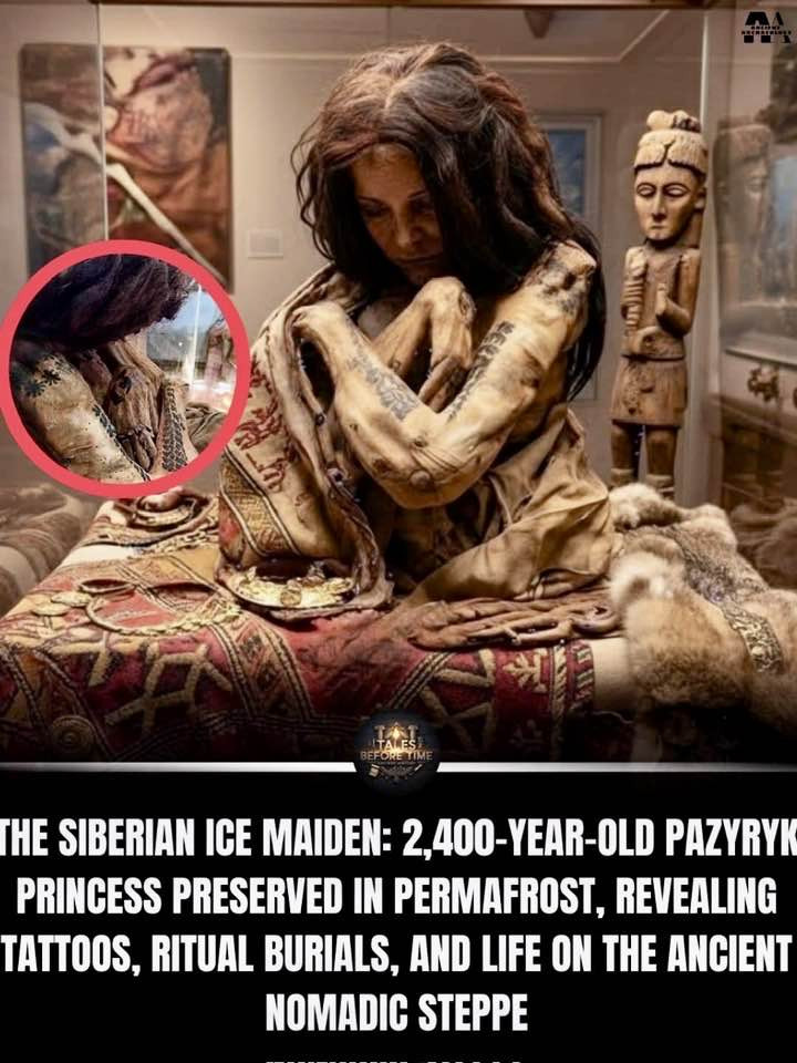 altay prensesi olarak da bilinen bu 2400 yıllık pazyryk kadını, sibirya bozkırlarının donmuş topraklarında korunmuş halde bulundu. mö 5. yüzyıla tarihlenen vücudu, buz tarafından o kadar iyi korunmuştu ki, mitolojik yaratıkları ve geyikleri tasvir eden karmaşık deri dövmeleri bugün bile açıkça görülebiliyor.