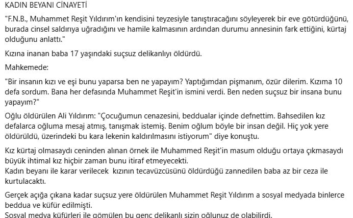 ulan kadının beyanı gerçek olsa da olmasa da kafana göre onu bunu öldürmemelisin zaten. namus cinayetlerine karşı çıkarken işte bu tür cinayetlere de karşı çıkıyoruz.