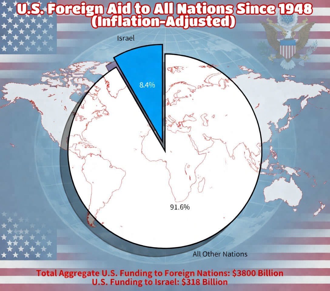 1948’de israel devleti’nin kurulmasından bu yana, abd dünya çapındaki ülkelere güncel enflasyona göre hesaplanmış 3,8 trilyon dolarlık dış yardım sağladı. israel, bu toplamın yalnızca %8,4’ünü oluşturan 318 milyar doları alırken, diğer tüm ülkeler geri kalan %91,6’sını aldı.