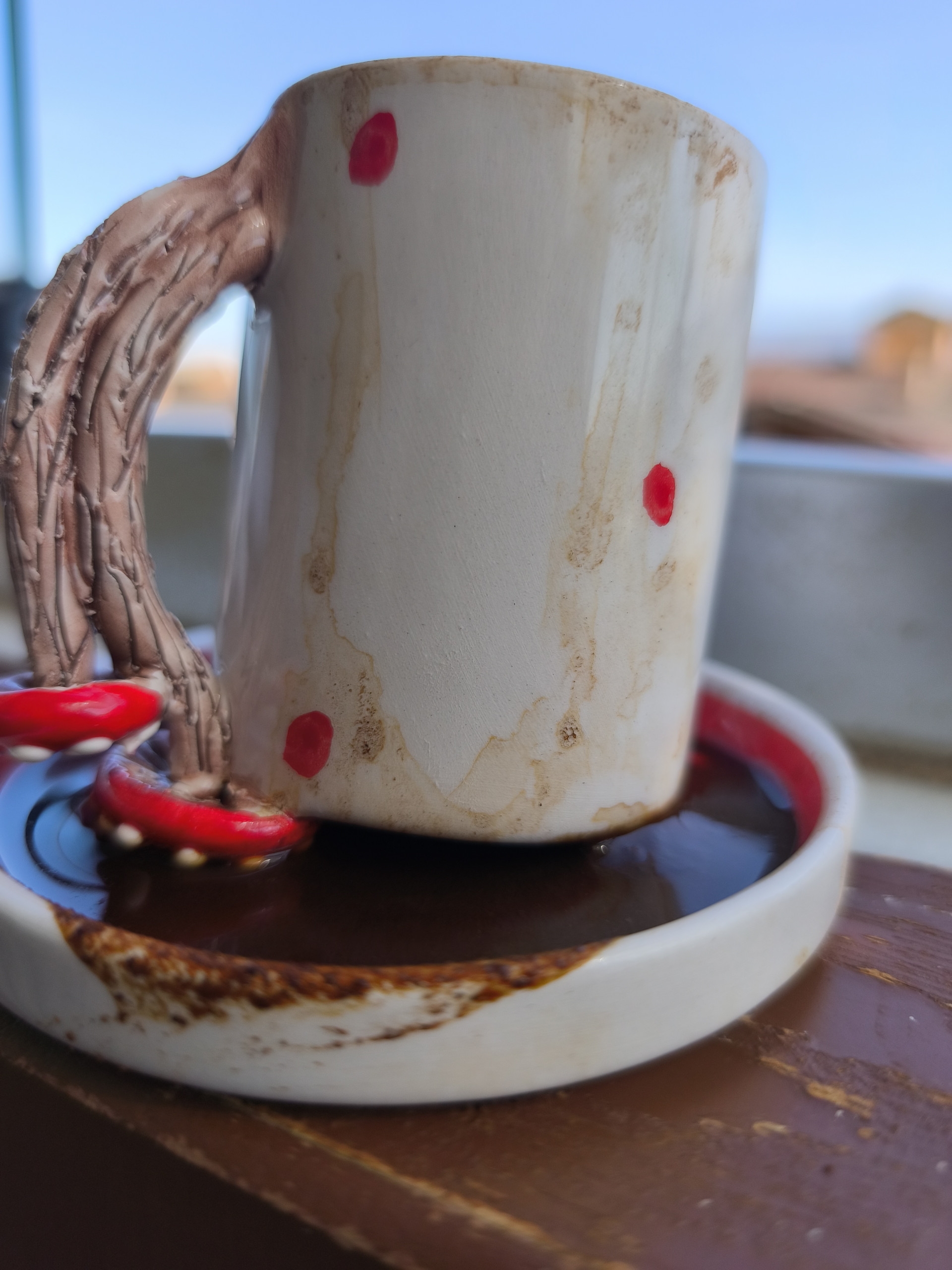 e bu kadarı da artık!!? kahve bitince el alışkanlığı ile ters çevirdim ve ne oldu? evet, bildiniz. yine döküldü. çünkü bunun mantarı vardı. bu fincana alışık olmadığım için unutmuşum. kahveyi ince halının üzerine döktüm. artık halı falı bakarım. hııım, falımda daha fazla mallık gözüküyor. dikkat etmezsem 3 vakte kadar başka şeyler de dökebilirsin diyor fal. evet.