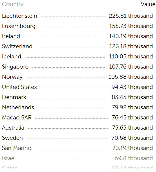 imf son güncel verilerine göre kişi başı gdp'de (gsyih) 69.800 abd doları ile 15. sıradadır. gelişmiş ekonomilerin ortalaması 66.180 dolar. dünya ortalaması ise 15.680 dolar. türkiye 19.020 dolar.
